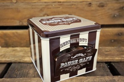 Une mini madeleine avec son nappage chocolat noir… Un régal à piocher à longueur de journée dans sa boîte distributrice!